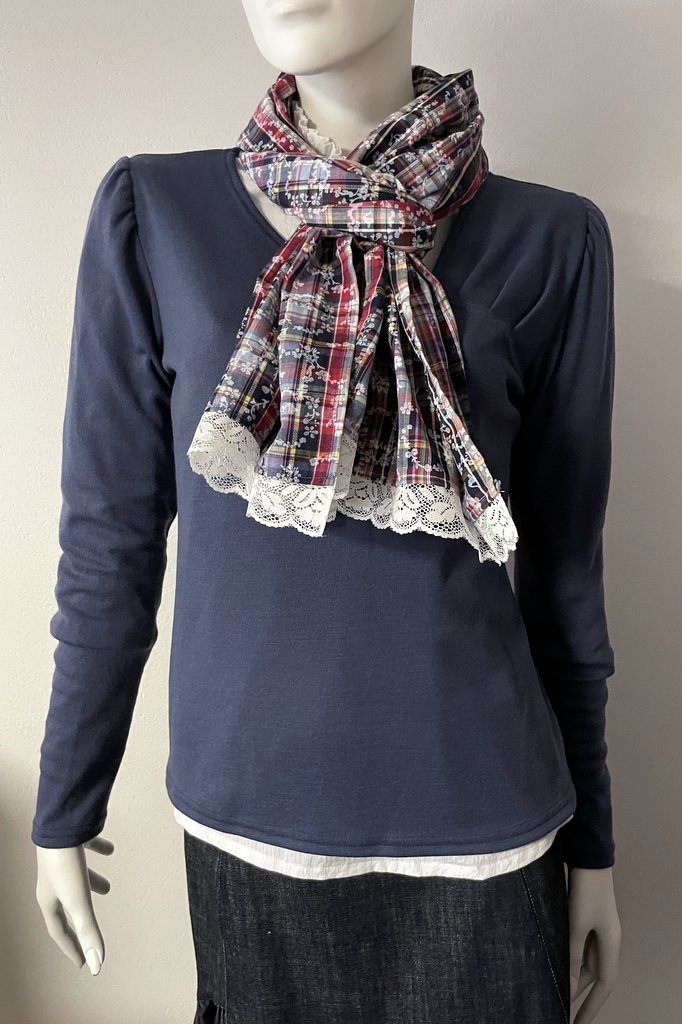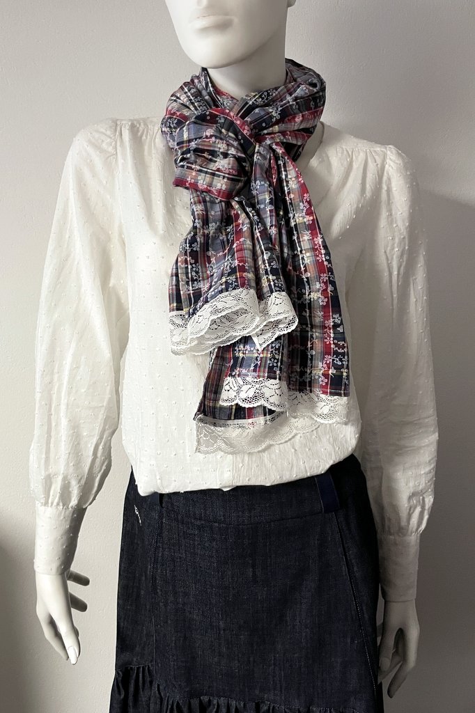 TVÄTTRÅD: Maskintvätt 40 grader i tvättpåse för spetsens skull. Det rutiga tyget kan strykas på medelvärme, men stryk ej på spetsen.
